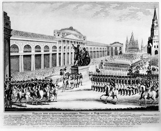 Рис. 4. Военный парад 20 февраля 1818 года при открытии памятника Минину и Пожарскому. Первоначально памятник поставили по оси Сенатской башни и Торговых рядов. В 1930 году монумент передвинули к собору Покрова на рву, то есть к собору Василия Блаженного [96], с. 113. Взято из [773], с. 172. См. также [96], с. 113, илл. 93, а также [708], с. 356.
