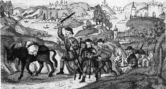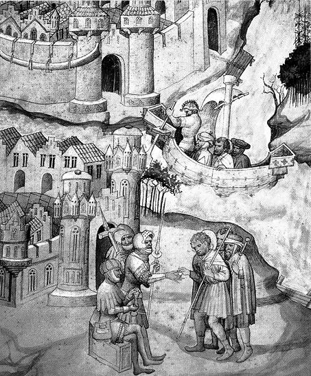 Рис. 6. Городская военизированная охрана берет деньги (транзитный налог) с паломников за разрешение войти в город Яффу (сегодня Тель-Авив), дабы потом продолжить свой путь в Иерусалим. Иллюстрация из книги Sir.J.Mandeville. Взято из [1083], с. 133.