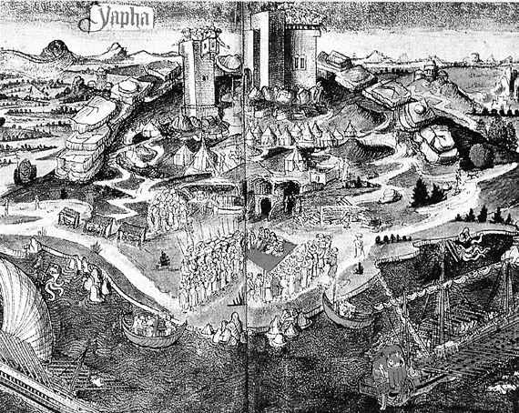 Рис. 7. Паломники, прибывающие в порт Яффы на венецианских кораблях. Из книги K. R. Grünemberg. Взято из [1083], с. 132.