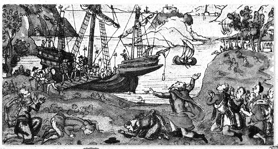Рис. 8. Паломники сходят с корабля и целуют Святую Землю. H. Wo» lffli. Взято из [1083], с. 146.