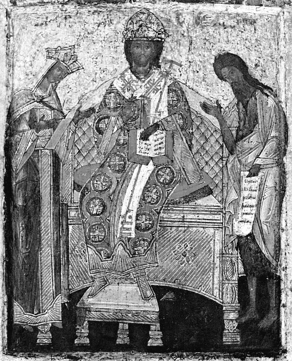 На рис. 9 мы приводим РОСТОВСКУЮ икону «Предста Царица» XVI века. Комментаторы справедливо отмечают: «В центре изображен восседающий НА ПРЕСТОЛЕ благословляющий Христос, представленный КАК ЦАРЬ и Великий Архиерей. ОН ОБЛАЧЕН В ПАРАДНЫЕ ОДЕЖДЫ ВИЗАНТИЙСКИХ ИМПЕРАТОРОВ – далматику, украшенную медальонами с крестами, и лор, длинный конец которого перекинут через руку… [Восседает] НА ЗОЛОТОМ ТРОНЕ, украшенном орнаментами» [120:1], с. 212. На голове Христа – царский венец. Царь-Христос в шитой золотом одежде, восседающий на золотом богатом троне показан и на другой ростовской иконе, рис. 10.