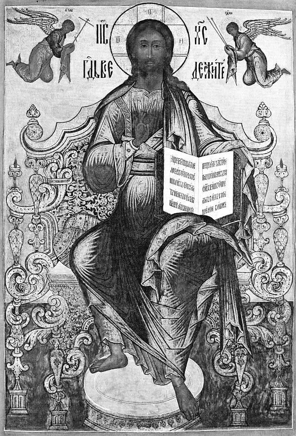 Рис. 10. Царь-Христос в шитой золотом одежде, восседающий на золотом богатом троне. Ростовская икона XVII века. Взято из [120:1], с. 287.
