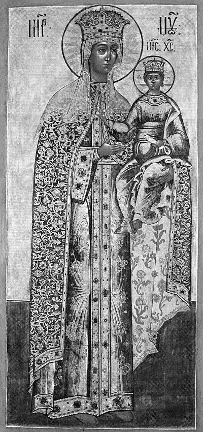 Аналогично в Ростове Великом изображали и Богородицу. На иконе, представленной на рис. 11, мы видим Марию в полный рост в расшитом золотом царском одеянии. На Ее голове – золотая царская корона с драгоценными камнями. Комментаторы отмечают: «Она облачена в зеленое царское платье, украшенное золотыми узорами и полосами с драгоценными камнями и жемчугом. Поверх платья надета малиновая мантия, скрепленная у шеи застежкой-фибулой и сплошь покрытая серебряным растительным орнаментом… На голове Богоматери – золотая царская корона, а под ней – светло-зеленый плат с золотым орнаментом и розово-красной каймой, украшенной жемчугом», с. 289.