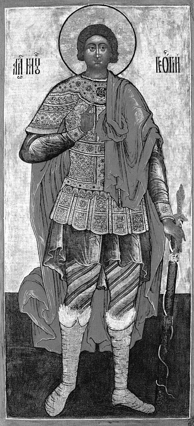 На рис. 12 показана ростовская икона XVII века из церкви Иоанна Богослова на Ишне, изображающая святого Георгия. То есть, как мы теперь понимаем, Георгия Победоносца. Комментарий таков: «Святой Георгий представлен в полный рост, фронтально, в воинском облачении – зеленой тунике, золотом панцире, украшенном орнаментами, и в красном плаще», с. 293.