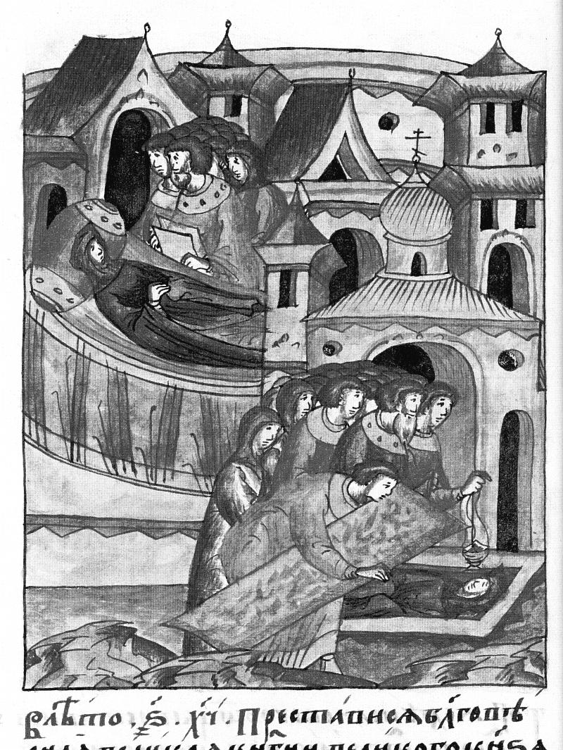 Рис. 15. Погребение великой княгини Ольги-Ефросинии, «второй жены» Великого князя Юрия-Георгия Долгорукого в 1182 году. Взято из [490:4], Лицевой Свод, «Русская Летописная история», кн. 3, лист Л‑400, оборот, с. 182.