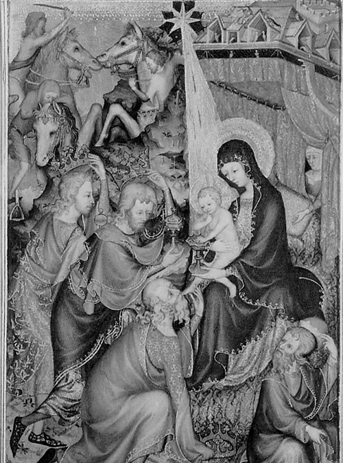 Рис. 1.7. Поклонение волхвов. Неизвестный французский художник. Якобы примерно 1360 год. Изображена Вифлеемская звезда, причем – в виде кометы, «хвостатой звезды». Взято из [38], с. 151, илл. 188.