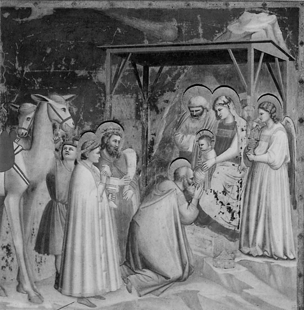 Рис. 1.8. «Поклонение волхвов». Джотто. Якобы XIII век. Вверху изображена Вифлеемская звезда в виде кометы, хвост которой вытянут влево вверх. Взято из [12], илл. 73.
