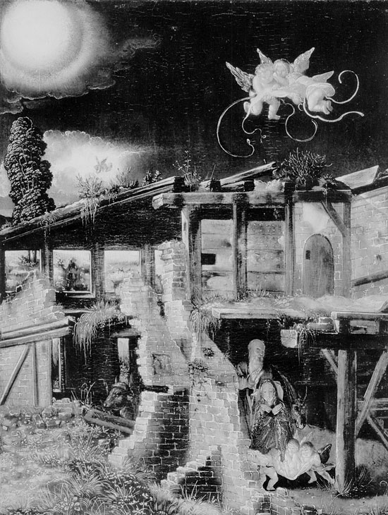 Рис. 1.10. «Рождество». Альбрехт Альтдорфер. Якобы около 1513 года. Вверху изображена Вифлеемская звезда, а ниже – более вытянутое светило с ангелом внутри. Может быть, это – комета. Взято из [150], с. 128, илл. 139.