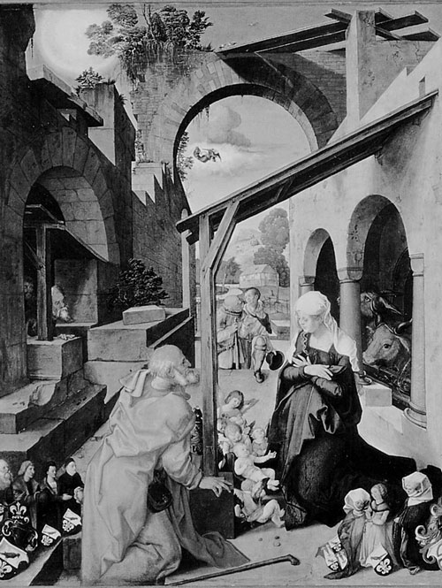 Рис. 1.11. «Рождество». Альбрехт Дюрер. Алтарь Паумгартнеров. Якобы 1500–1502 годы. Слева вверху – огромная вспышка Вифлеемской звезды, а чуть ниже и правее – вытянутое светило с летящим на его фоне ангелом. Вероятно, это – комета. Взято из [5], с. 203.