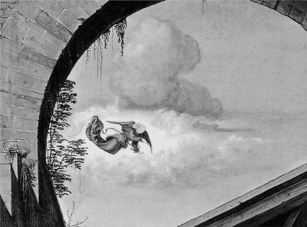 Рис. 1.12. Фрагмент средневекового алтаря Паумгартнеров с изображением вытянутого небесного светила с летящим ангелом. Вероятно, это – изображение кометы. Взято из [5], с. 205.
