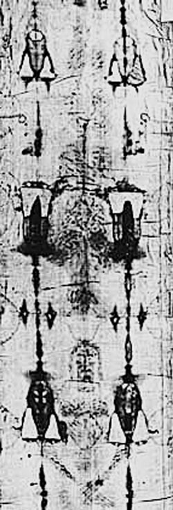 Туринская плащаница приковала к себе всеобщее внимание после того, как в 1898 году фотограф Секундо Пиа (Secundo Pia) сделал по поручению церковных властей ее первые фотографии [13], [47]. Проявив фотопластинку, он с удивлением обнаружил, что на негативе возникло четкое позитивное изображение человеческого тела спереди и сзади. Оказалось, что изображение на Плащанице – негативное. Кроме того, оно плохо видно при взгляде не на просвет. Напомним, что сегодня (и уже давно) Плащаница нашита на другую ткань. Так было сделано для сохранности, поскольку ткань Плащаницы тонкая и уже достаточно ветхая. Поэтому на просвет ее посмотреть уже нельзя, а при обычном осмотре видны лишь общие смутные очертания. На фотографическом же негативе получилось довольно четкое реалистическое изображение, с проработкой мелких деталей.