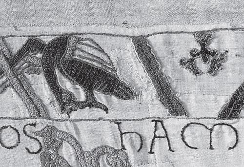 Напомним, что ковер из Байе дошел до нас после нескольких переделок, сегодня уклончиво именуемых «реставрациями». Не исключено, что некий первоначальный вариант изображений на ковре действительно был создан вскоре после Троянской войны XIII века как память о ней. И лишь через какое-то время могли принять решение выткать ковер, на котором были бы нанесены старые рисунки XIII–XIV веков. Это могло произойти и достаточно поздно, в XV–XVI веках. Как мы убедимся, создатели ковра из Байе были уже достаточно далеки от описываемых событий, суть которых стала для них уже во многом туманной. Что не могло не сказаться на воспроизводимых ими рисунках. Из-за непонимания смысла в изображения вкрадывались искажения, ошибки. Нельзя исключать и преднамеренную редакторскую правку. Все это следует иметь в виду при анализе дошедших до нас изображений на ковре.