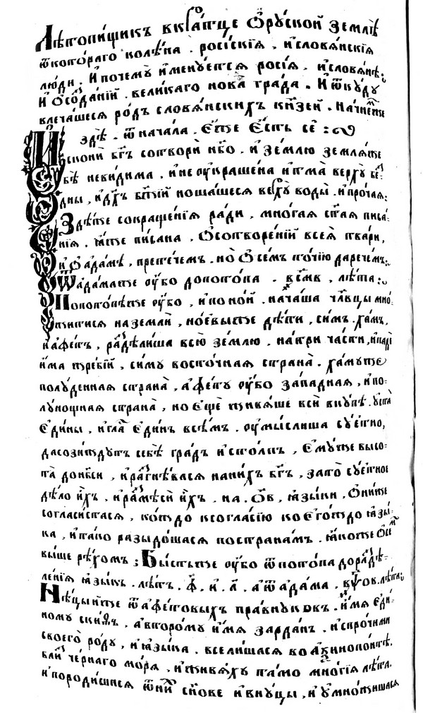 ЛЕТОПИСЩИК вкратце О РУСКОЙ ЗЕМЛЕ, ОТ КОТОРОГО КОЛЕНА РОСИСКИЯ И СЛОВЯНСКИЯ ЛЮДИ, и почему именуется Росия и словяне, и о создании Великаго Нова града, И ОТКУДУ ВЛЕЧАШАСЯ РОД СЛОВЯНСКИХ КНЯЗЕЙ. НАЧНЕМ ЖЕ ЗДЕ ОТ НАЧАЛА, ЕЖЕ ЕСТЬ СЕ: