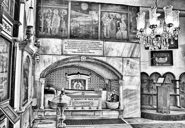 Рис. 7. Новодельная «рака для ризы (или омофора) Богородицы» во Влахернском монастыре в Стамбуле. Наверху в центре помещена живописная картина, изображающая тонущие ладьи русских князей, напавших на Царьград. Фотография 2008 года.