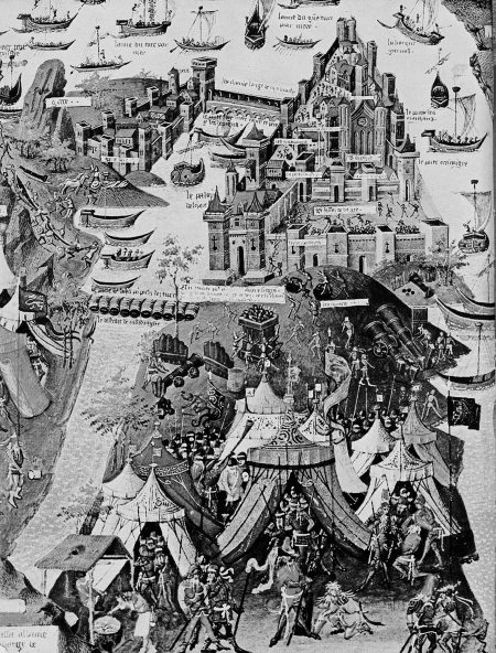 В книге [101] приведена замечательная цветная средневековая миниатюра XV века, изображающая осаду Константинополя османами-атаманами в 1453 году [101], с. 38. См. рис. 1.5. Миниатюра взята из книги XV века: Jean Meilot, «Passages d'Outremer», хранящейся в Национальной библиотеке Парижа. Считается, что это – редкое изображение, СОВРЕМЕННОЕ самому событию. И что же мы видим?