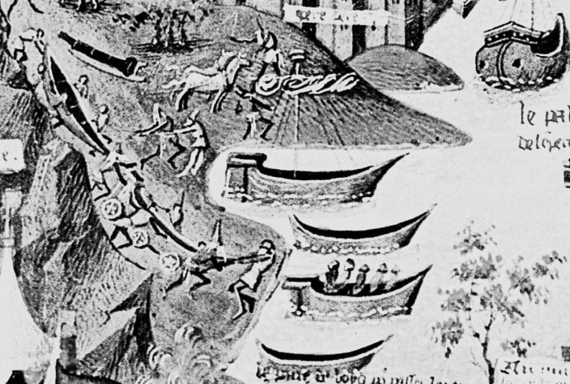 Рис. 1.11. Османы-атаманы перетаскивают свои большие лодки по суше, поставив их на колеса. Таким путем часть флота была переправлена в залив Золотой Рог и оказалась прямо у стен Царь-Града. Буквально то же самое сделал русский князь Олег; штурмуя Царь-Град. Взято из [101], с. 38