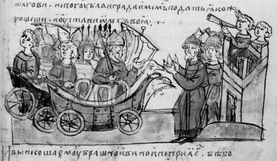 Вот как описывает это яркое событие Н. М. Карамзин: «В летописи сказано, что Олег ПОСТАВИЛ СУДА СВОИ НА КОЛЕСА и силою одного ветра, на распущенных парусах, СУХИМ ПУТЕМ ШЕЛ СО ФЛОТОМ К КОНСТАНТИНОПОЛЮ. Может быть (совершенно справедливо указывает параллель Карамзин – Авт.) ОН ХОТЕЛ СДЕЛАТЬ ТО ЖЕ, ЧТО СДЕЛАЛ ПОСЛЕ МАГОМЕТ II: ВЕЛЕЛ ВОИНАМ ТАЩИТЬ СУДА БЕРЕГОМ В ГАВАНЬ (то есть в Золотой Рог – Авт.), чтобы приступить к стенам городским» [52], т. 1, гл. 5, столбец 79. Карамзин здесь все подметил верно. Только подлинного смысла не понял. Поскольку взятие Олегом Царь-Града и взятие Царь-Града Магометом II – это, по-видимому, ОДНО И ТО ЖЕ событие. И «оба они» поэтому катят свои лодки по суше НА КОЛЕСАХ. Насколько нам известно, эта история уникальна и связана именно со взятием Константинополя.