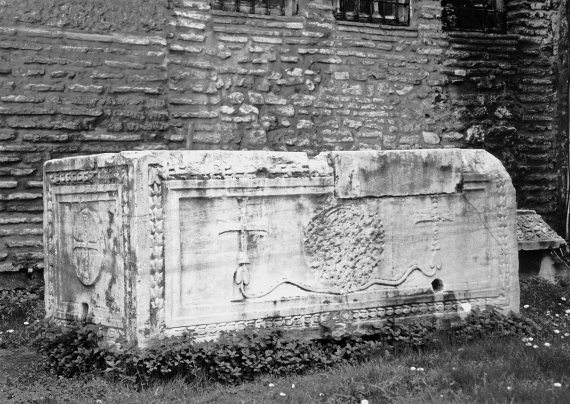 Рис. 1.16. Стена храма Святой Софии справа от главного входа. Ясно видна КИРПИЧНАЯ кладка. Перед стеной стоит саркофаг, над которым виден ряд окон, расположенных чуть выше человеческого роста. Следов окон, вросших в землю, нигде не видно. Фотография 1996 года