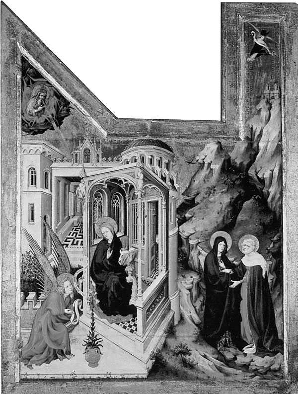 Рис. 1.7. Слева – «Благовещенье». Обратите внимание на христианские кресты в виде свастики, изображенные на полу слева. Справа – «Встреча Марии с Елизаветой». Мельхиор Брудерлам. Створка Алтаря из монастыря Шанмоль. Якобы 1392–1399 годы. Музей изящных искусств. Дижон. Взято из [143:0], с. 40.