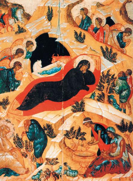 Рис. 1.10. «Рождество Христово». Русская икона первой половины XV века. Государственная Третьяковская Галерея. Взято из [745:1], с. 210, икона 398.