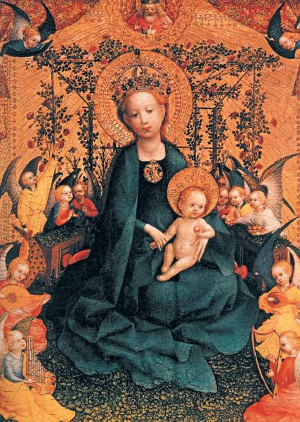 Рис. 1.13. Ангелы, окружившие Марию и Младенца Христа. Стефан Лохнер. «Богоматерь в беседке из роз». Якобы 1450 год. Музей Вальраф-Рихарц. Кельн. Взято из [143:0], с. 83.