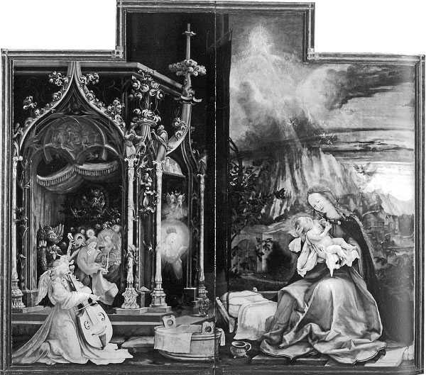Рис. 1.15. «Ангельский концерт». Изенгеймский Алтарь. Якобы 1515 год. Музей Унтерлинден. Кольмар. Поющие и играющие ангелы славят Рождение Иисуса. Взято из [143:0], с. 246.