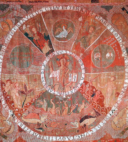 Рис. 1.17. Средневековый вышитый ковер (собор Жероны, Испания) с изображением Сотворения Мира. Иллюстрируются первые страницы библейской книги Бытие. Слева внизу показано рождение Евы из ребра Адама. Она появляется из бока Адама. О связи этого библейского сюжета с кесаревым сечением см. наши книги «Царь Славян» и «Начало Ордынской Руси». Отметим, что в центре ковра Бог Отец изображен в виде Иисуса Христа, с нимбом вокруг головы и крестом на нимбе. Взято из [643:2], с. 193.