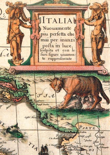 Рис. 1.25. Римская Волчица с младенцами Ромулом и Ремом. Фрагмент средневековой карты Италии, составленной Хондиусом (Henricus Hondius) около 1631 года. Взято из [1027], карта 19.
