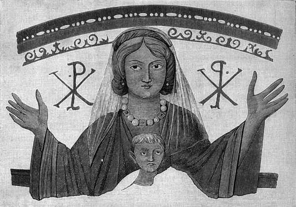 Рис. 1.29. «Богоматерь с Младенцем». Фреска в катакомбах итальянского Рима. Фактически это – известная новгородская икона Знамение. Взято из [169:0], с. 344, илл. 302.