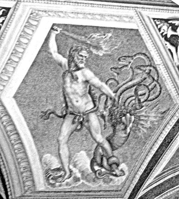 Рис. 33. Зодиак VG: Геркулес, убивающий Гидру. Слева внизу, у ноги Геракла изображен РАК. Астрономическое содержание: СОЗВЕЗДИЕ РАКА. Взято из [1238:2], с. 59.