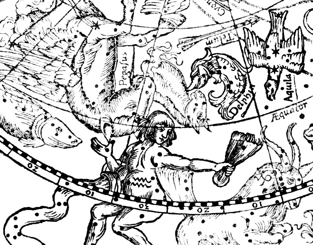 Рис. 36. Созвездия Водолея, Дельфина и Орла (Aquila). Фрагмент звездной карты северного полушария из издания Альмагеста 1551 года. Мы выделили здесь указанные три созвездия, приглушив остальное. Взято из [543], вклейка между страницами 216–217.