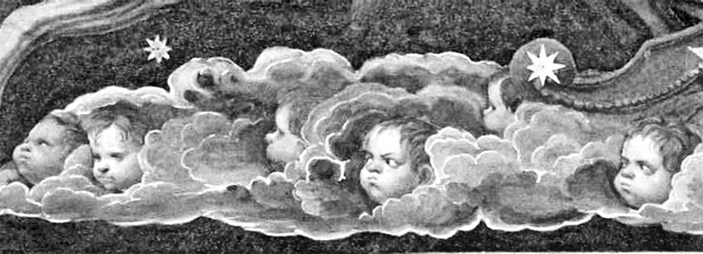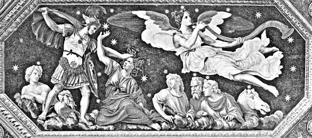 Второе центральное изображение на потолке залы Галатеи, представленное в увеличенном виде на рис. 42, может быть просто дополнением к первому (рис. 40). А именно, на нем могут быть изображены вне-зодиакальные созвездия над созвездием Тельца, где находился Юпитер – созвездие Персея в виде Персея, убивающего Медузу, созвездие Андромеды (которую спасает Персей) в виде крылатой девушки в белом платье и созвездие Пегаса в виде конской головы в правом нижнем углу, рис. 42. Остальные фигуры внизу, наполовину высовывающиеся из облаков, могут означать наиболее яркие звезды в этих созвездиях.