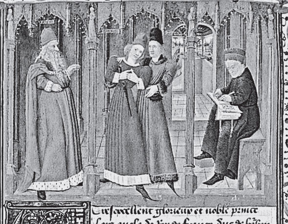 Рис. 10. Миниатюра якобы XV века. Цицерон и другие якобы «античные» персонажи изображены как средневековые люди в средневековой обстановке. Современный комментарий: «Лелиус (слева), Энниус и Сцевола (в центре); Цицерон сочиняет трактат “О дружбе”»