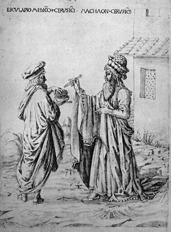 Рис. 1.38. Асклепий-Эскулап и Махаон. Гравюра из «Флорентийской Иллюстрированной Хроники». Взято из [1267], лист LIV.