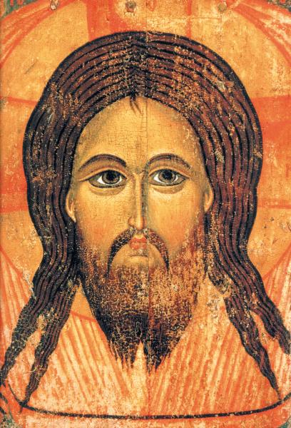 Рис. 1.39. Русская икона «Спас Нерукотворный». Первая половина XIII века. Государственная Третьяковская Галерея. Обратите внимание на длинные волосы Христа. Взято из [745:1], с. 11, икона 3.