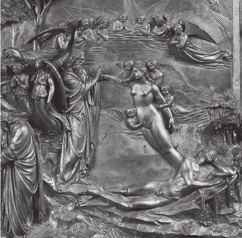 Рис. 1.7. Появление Евы из бока лежашего Адама. Фрагмент «Райских врат» Лоренцо Гиберти. Якобы XV век. Флоренция, Баптистерий. Взято из [315:1], с. 182.