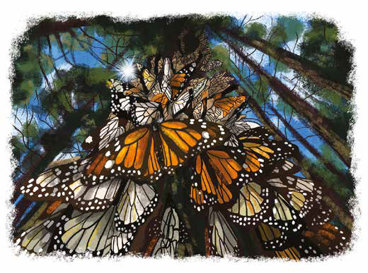 – Эти чудесные бабочки зимуют в горных лесах Мексики. Никто не знает, сколько их точно, но примерные расчёты показывают, что здесь собирается до миллиарда особей.