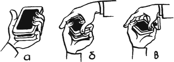 «…Возьмите колоду в левую руку, за ее длинные стороны, крапом (обратной стороной карты – А.К.) вверх, как делается при сдаче. В этом проложениибольшой палец будет, конечно, налегать на колоду слева, а прочие пальцы – справа. Положите верхний сустав мизинца непосредственно на те карты, которые должны быть переложены на верх (и которые теперь внизу), а остальные три пальца пусть налегают на остальные верхние карты (рис. 1, а). В этом положении окажется, что верхняя часть колоды удерживается между мизинцем, находящимся внизу, и прочими пальцами, находящимися наверху. Приблизьте правую руку и прикройте ею колоду. Захватите нижнюю половину колоды вдоль, между вторым пальцем с верхнего и большим пальцем с нижнего края, между тем как большой палец левой руки лежит слегка согнутый поперек колоды. Прижмите внутренний край нижней половины в то место, где отходит от кисти левый большой палец, так чтобы обе половины лежали как показано на рис. 1, б. Подвиньте к наружи верхнюю половину, слегка расширив пальцы левой руки и в то же время приподняв наружный край нижней половины – до тех пор, пока края обеих половин совершенно разойдутся (рис. 1, в), после чего простым закрытием левой руки они снова сложатся вместе, только обменявшись местами. Сделайте все это медленно, заботясь только о чистоте и безукоризненности исполнения. Сначала дело покажется несколько трудным, но постепенно руки приобретут род симпатической привычки, различные вышеописанные движения сольются как бы в одно, и две половины колоды будут переменять свои места с такой легкостью и быстротою, как будто они проходят одна сквозь другую. Легкое мгновенное сжатие и поднятие рук (жест, по-видимому, совершенно машинальный) в акте вольта делают совершенно незаметным переложение карт, которое в руках адепта (увлеченного ученика – А.К.) ускользает от внимания самого бдительного зрителя».