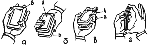«Когда колода карт снята партнером, а части А и Б разделены, находясь в разных руках, нижняя часть колоды А – в правой руке, а верхняя часть колоды В – в левой руке, тогда левая рука загибает один палец, а именно мизинец, покрывая им часть В (рис.2а), делая это скрытно, неприметно для игроков и быстро. Правая рука мгновенно набрасывает часть А на часть В так, чтобы процесс действия мизинца и сам мизинец не был виден партнерам по игре. Часть А, само собой разумеется, наброшена сверху на мизинец левой руки, под которым находится часть В, а правая рука в это время должна покрывать всю колоду и закрывать ее от посторонних взглядов. Затем правая рука поправляет колоду так, чтобы край колоды, смотрящий на партнеров, был единым, границы раздела между частями А и В не было видно (рис. 2б), а край колоды, обращенный к шулеру, был бы расщеплен мизинцем левой руки (рис.2в). Все это шулер делает над столом, но старается прижимать карты ближе к себе.
