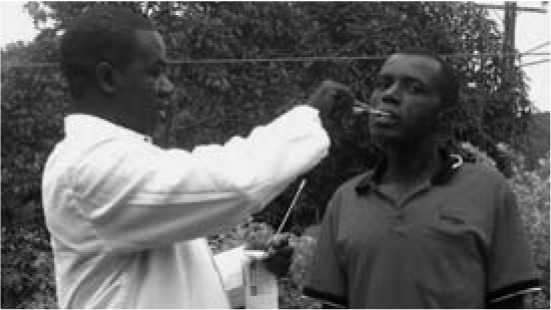 Получение образца ДНК в юго-западном Камеруне (предоставлено В. Schrack). Хотя фото представлено в связи с тестированиями гаплогруппы A00 в Камеруне, неизвестно, какую гаплогруппу выявит данный конкретныйтест.