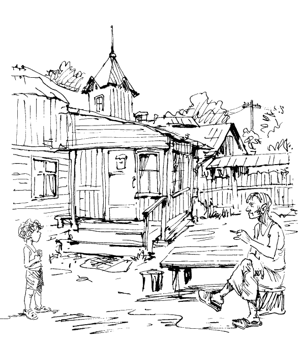 Неизвестно, какой архитектор нафантазировал это нагромождение деревянных скворечен в два этажа, скрипучих лестниц, полутёмных переходов с подгнивающими досками. Дополнением к его зодческим фантазиям служил маленький, с непременным столом, вкопанным в землю, четырьмя корявыми пеньками и отполированными до блеска лавками, дворик, окружённый высоченным забором, за которым была скрыта от постороннего глаза бурная жизнь многодетных семей. Как правило, семьи эти состояли в близким родстве, сам же дом, первоначально задуманный как добротное одноэтажное строение, начинал возводить один из удачливых дедов-прадедов, а поскольку потомки старательно воплощали в жизнь библейскую заповедь «плодитесь и размножайтесь», то каждому сыну или дочери перед свадьбой пристраивалась отдельная комната, и тогда дом расширялся, карабкался вверх мансардами и чердаками, пока не выяснялось, что дальше строить некуда, дальше – забор, а за ним – улица, и тогда в комнатах ставились перегородки, примусы выносились на лестницы, которые, в свою очередь, срочно обшивались рамами и превращались в кухни.