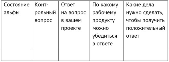 Основываясь на этих состояниях, предложите набор состояний альфы внешних проектных ролей, понимая, что осмысленная оценка состояния будет у вас только после разбиения на подальфы и оценки состояния каждой отдельной проектной роли. Тем не менее, как состояния внешних проектных ролей могли бы быть сформулированы для вашего учебного проекта? Оцените состояние вашего проекта по адаптированному варианту. Для каждого контрольного вопроса отведите одну строчку таблицы, колонку дел для получения положительного ответа заполните только для очередных пяти дел, чтобы не злоупотреблять upfront планированием в agile проекте курса.