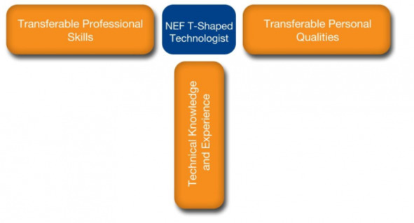 Концепция Т-людей стала популярна, и породила множество образовательных проектов, например, в 2012 году проект NEF (New Engineering Foundation Великобритании) так и названный: Т-образное обучение (T-shaped Learning)76. В этом проекте предлагалось сделать NEF Т-образного технаря (Technologist не «технолог», он именно «технарь»). Такой Т-образный технарь заявлялся как новый тип человека, получаемый путём нового типа обучения, T-образного обучения. Проект NEF должен был организовать выпуск T-образных технарей. Вот так это представлялось картинкой: