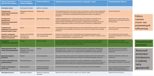 Вот табличка системных уровней как уровней ролей/«функциональных/ролевых частей» члена сообщества социальных танцев, которая примерно поясняет тут рассказываемое (а что написано в заголовках таблички, будет понятно чуть позже в ходе курса). Можно также рассматривать эту табличку как стек танцевальных методов/культур/практик. 33