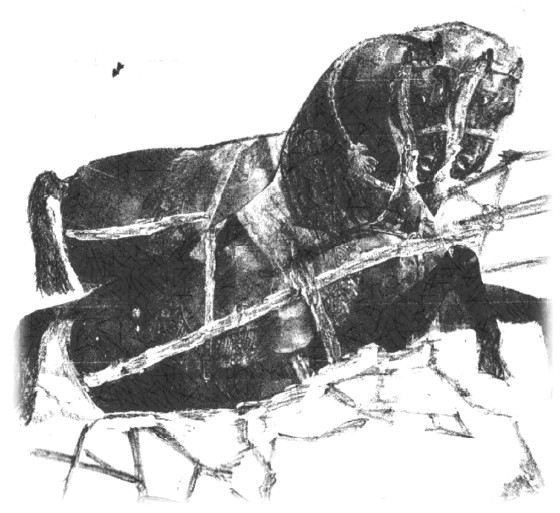 Почувствовав свободу, кони стали взбираться на лёд, обламывая его, и всё ближе и ближе приближались к берегу. Но чем мельче становилось, тем труднее им было. Их ноги начали вязнуть в топком дне, и, выбившись из сил, они обречённо замерли, положив головы на лёд.