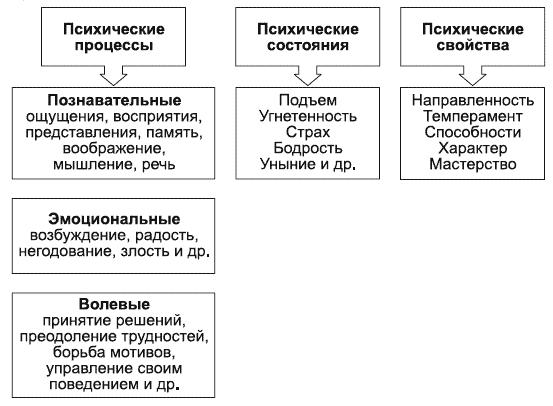 Необходимо отметить, что существуют различные точки зрения на структуру психических явлений. Однако наиболее часто встречается деление психических явлений на три основных класса: психические процессы, психические состояния и психические свойства личности (рис. 1).
