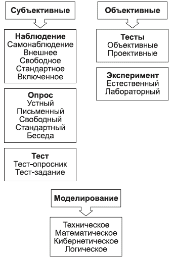 Все методы, используемые в настоящее время в психологии, могут быть разделены на две большие группы (рис. 2): на объективные и субъективные методы. Субъективные методы, в отличие от объективных, базируются либо на самооценке испытуемых, либо на точке зрения психолога-исследователя на ту или иную проблему.