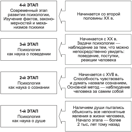 Психология, как и любая другая наука, прошла определенный путь развития. В ее истории можно условно выделить четыре этапа (рис. 3). На первом этапе психология существовала как наука о душе, на втором – как наука о сознании, на третьем – как наука о поведении, а на четвертом – как наука о психике. Рассмотрим более подробно каждый из них.