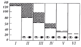 Рис. 1.2. Взаимоотношение порогов улитко-зрачкового рефлекса и порогов слухового ощущения на разных стадиях течения патологического процесса у больных с нарушением слуха после воздушной контузии. Ордината – интенсивность звукового раздражения в децибелах относительно нормального абсолютного слухового порога (0 дБ); абсцисса – стадии патологического процесса. 130 дБ – полная глухота; сплошная жирная линия – порог слухового ощущения; пунктирная – порог улитко-зрачкового рефлекса; заштрихованная поверхность – диапазон субсенсорной активности. I – тотчас после травмы; II–V – стадия восстановления слуховой чувствительности; VI – норма. Внизу – схематическое изображение степени расширения зрачка (слева при отсутствии раздражения, справа – при действии звука)