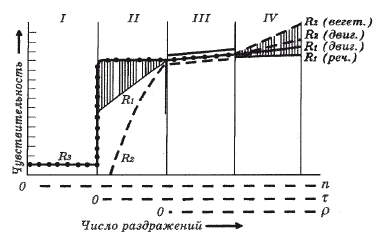 Рис. 1.3. Схема изменений, определяемая по разным реакциям чувствительного анализатора в зависимости от общего числа наносимых раздражителей n, раздражителей, являющихся сигналами определенных ответных реакций, r и числа неподкрепляемых (дифференцировочных) раздражителей p. R1 – реакции, обусловленные речевой инструкцией испытуемому: R1 реч. – словесный ответ (типа «Вижу», «Слышу».); R1 двиг. – произвольная условная двигательная реакция. R2 – условно-рефлекторные реакции, вырабатываемые при безусловном подкреплении: R2 двиг. – условные мигательные; R2 вегет. – условные кожно-гальванические. R3 – реакции, возникающие без специальной выработки и речевых инструкций. Область расхождения порогов непроизвольных и словесной реакции заштрихована. I–IV – стадии изменения чувствительности. Переход от I стадии ко II соответствует приобретению раздражителем значения условного сигнала реакции R1 или R2. Ось ординат – чувствительность в условных единицах; ось абсцисс – число n, r, p